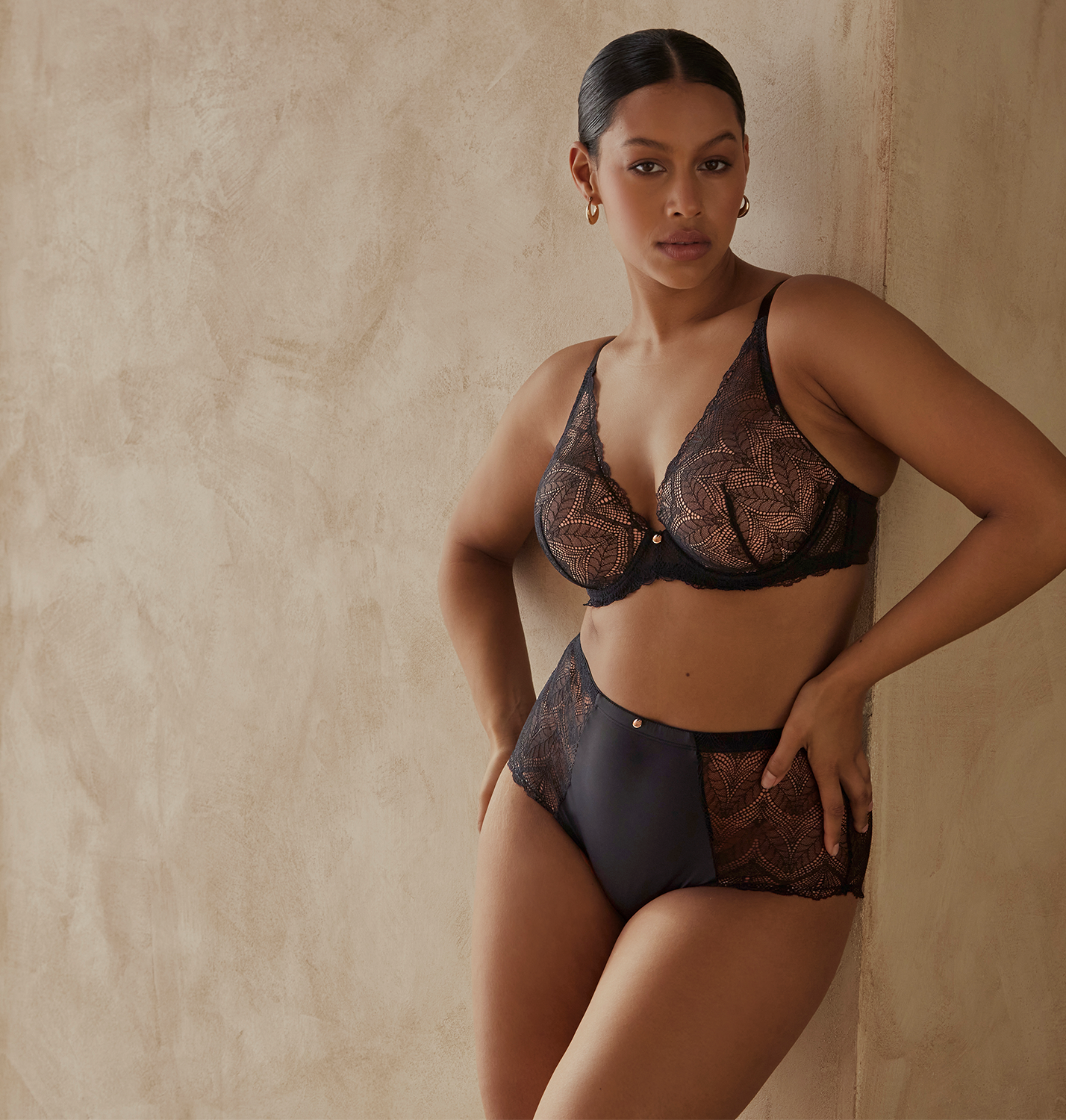 Taking the wearability of honey foundations, the Decolette Collection elevates with intricate lace overlay, scalloped trims and gold accents for a decidedly fresh iteration of the little black set that isn’t constrained exclusively to occasion dressing. Including a triangle semi contour bra spanning B-EE cup sizes, with high bikini and string brief options to match.