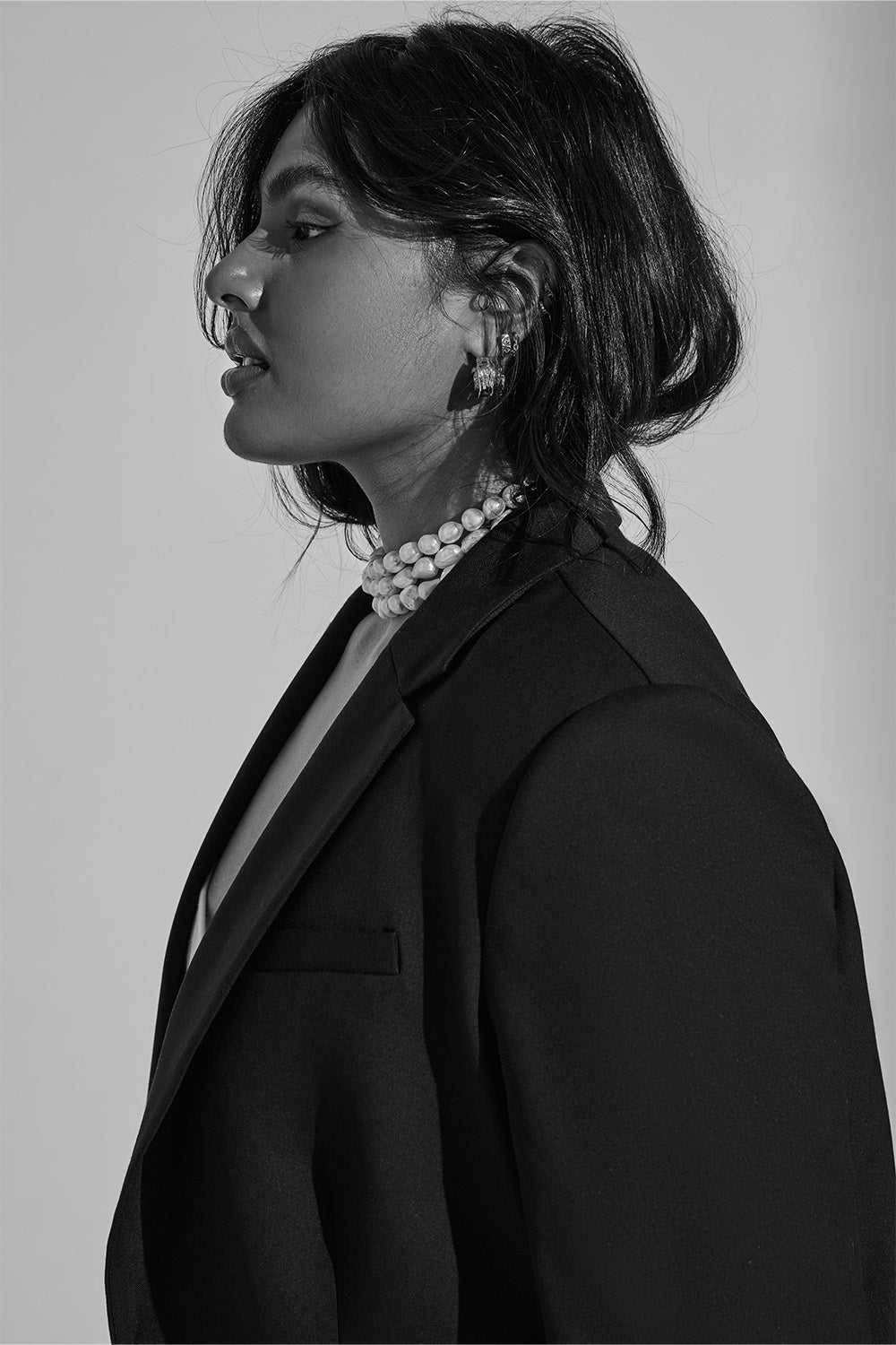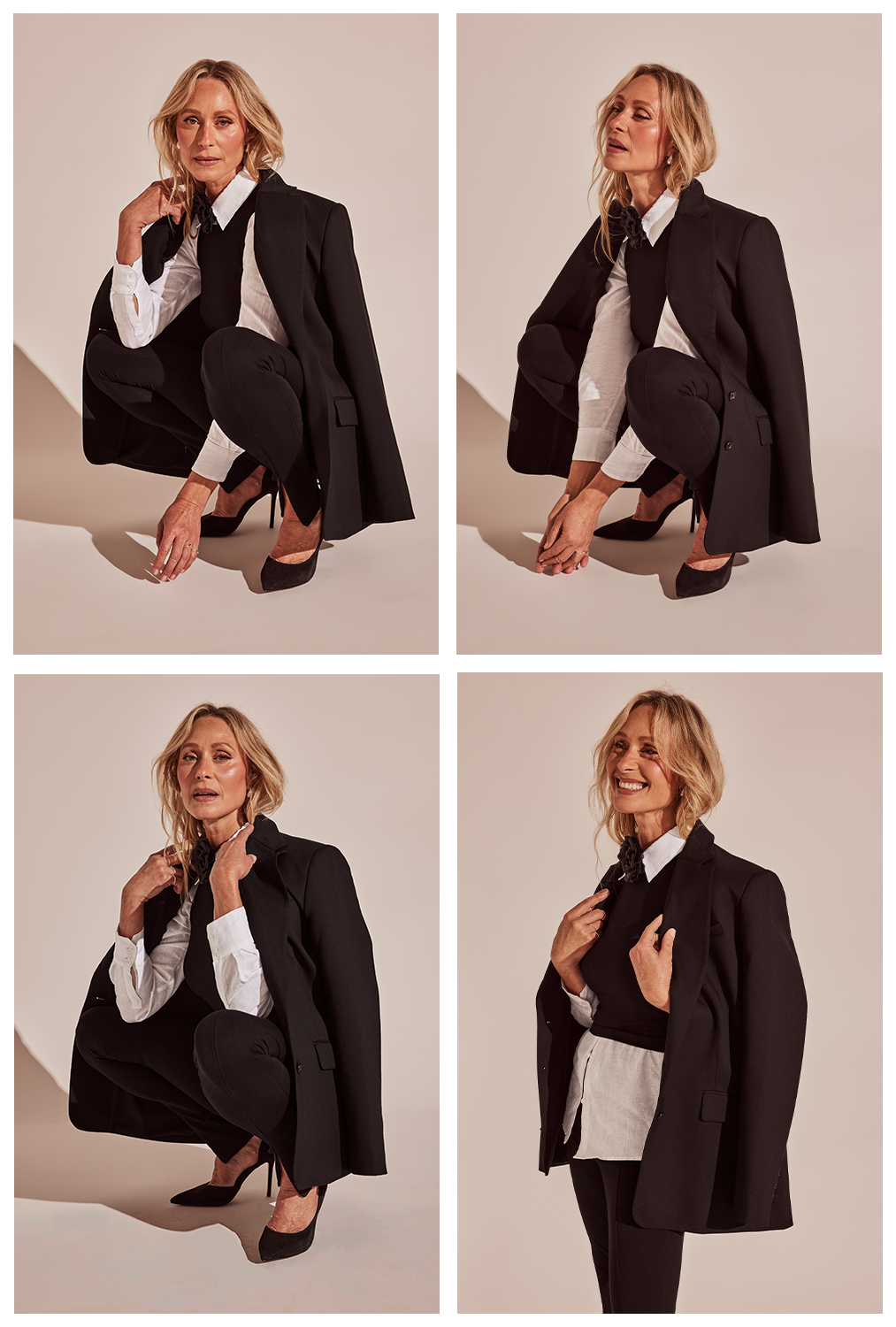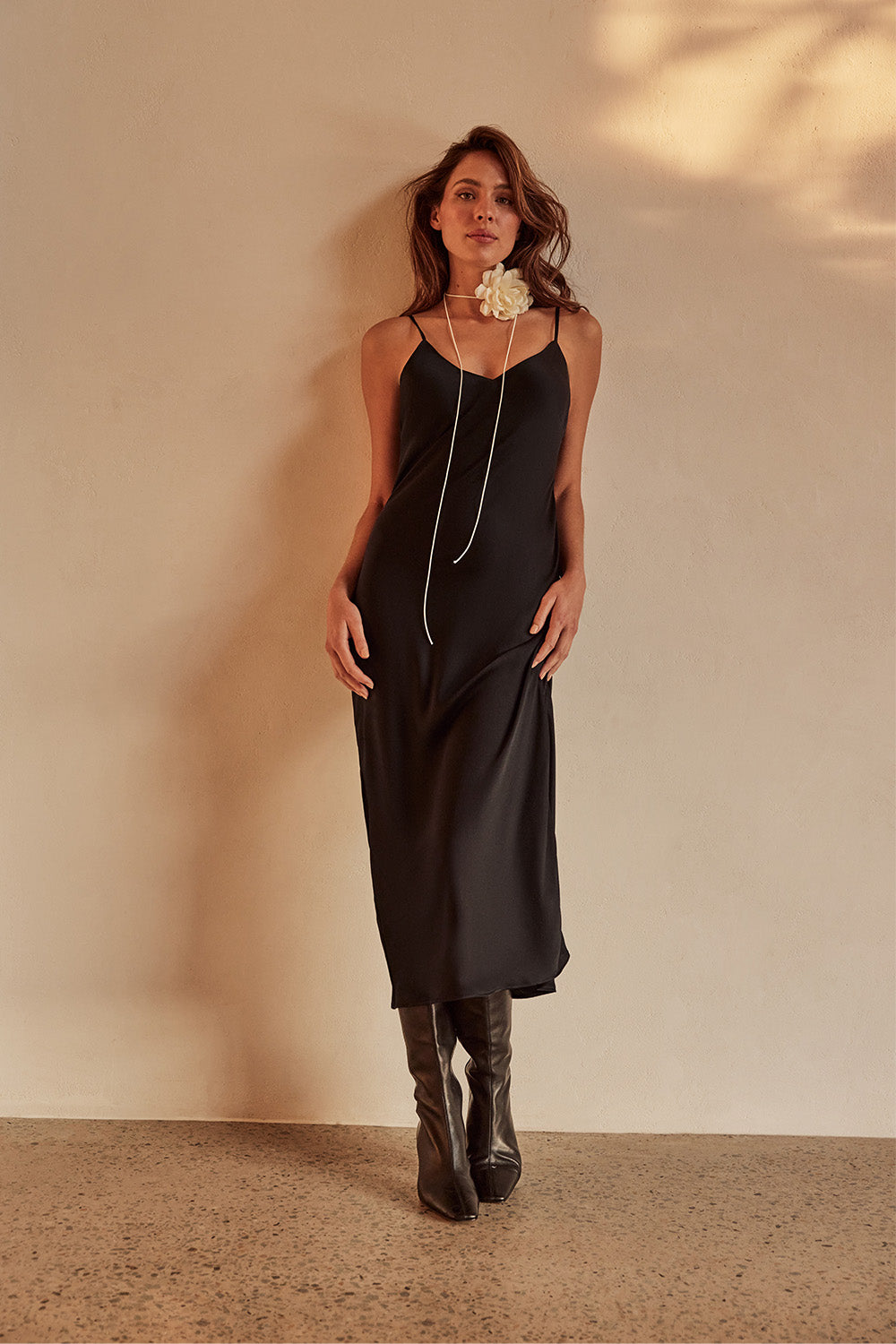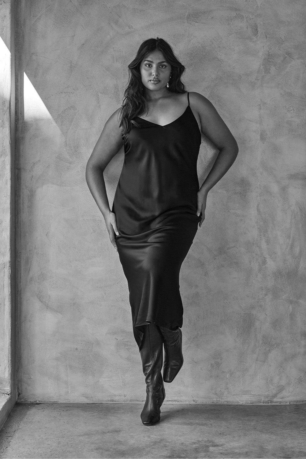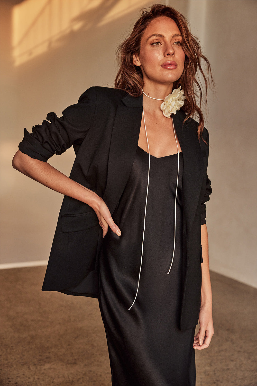 Exuding confidence in its simplicity and an undeniably timeless quality; luxury textural clashes, superior fabrics and a classic monochrome palette deliver sophisticated wear always. Featuring the Wool Blazer; tailored to perfection with a boxy yet balanced feminine/masculine shape, and the Silk Slip Dress; a flattering bias-cut, 100% silk midi to cascade beautifully across the silhouette.