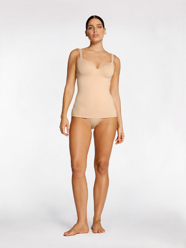 Bridging the divide between under and outerwear; a cami bra gently smooths the silhouette, with a concealed t-shirt bra beneath omitting the need for unnecessary layering. We recommend multiple colours for easy layering through the seasons.