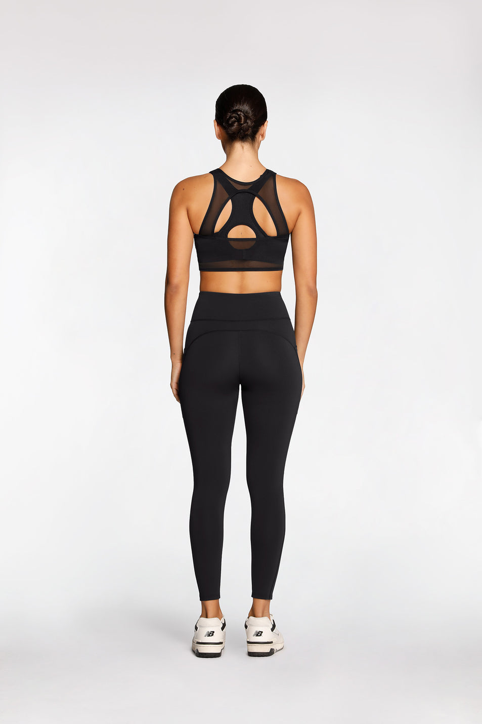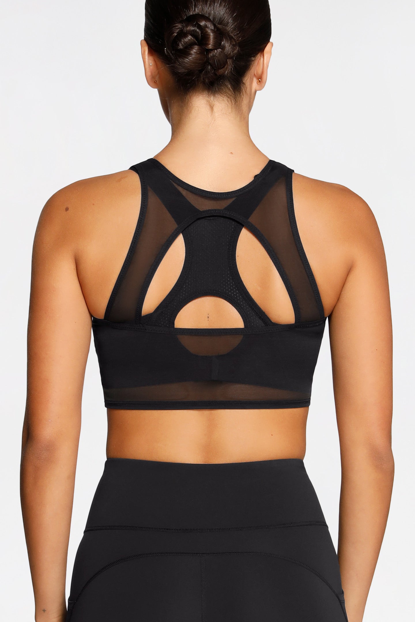- Stretchy, weightless mesh with high scoop neckline and open back