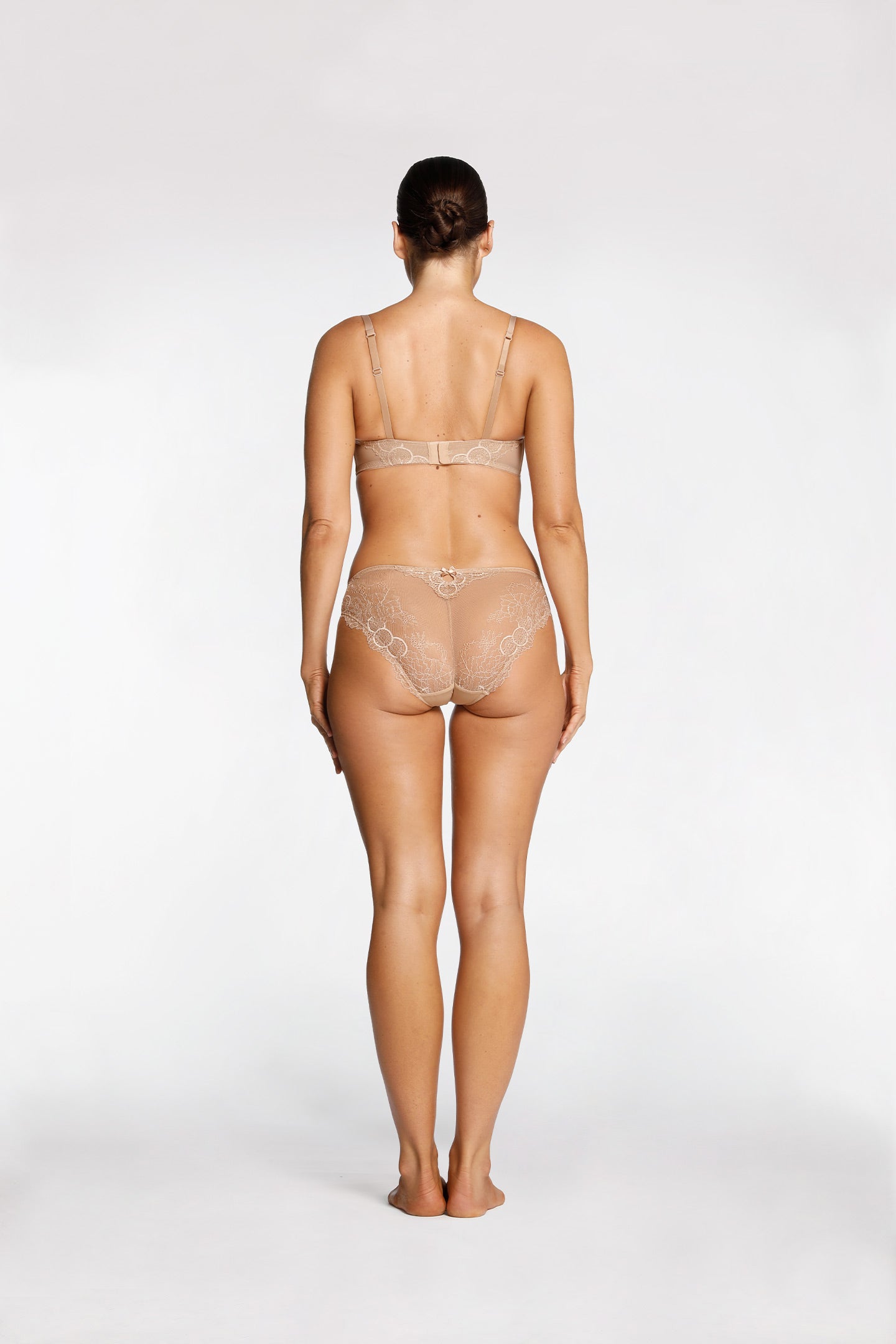 - Scalloped edge across neckline and band complement wide set straps and straight neckline to completely frame the bust