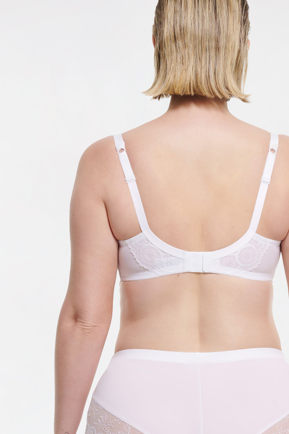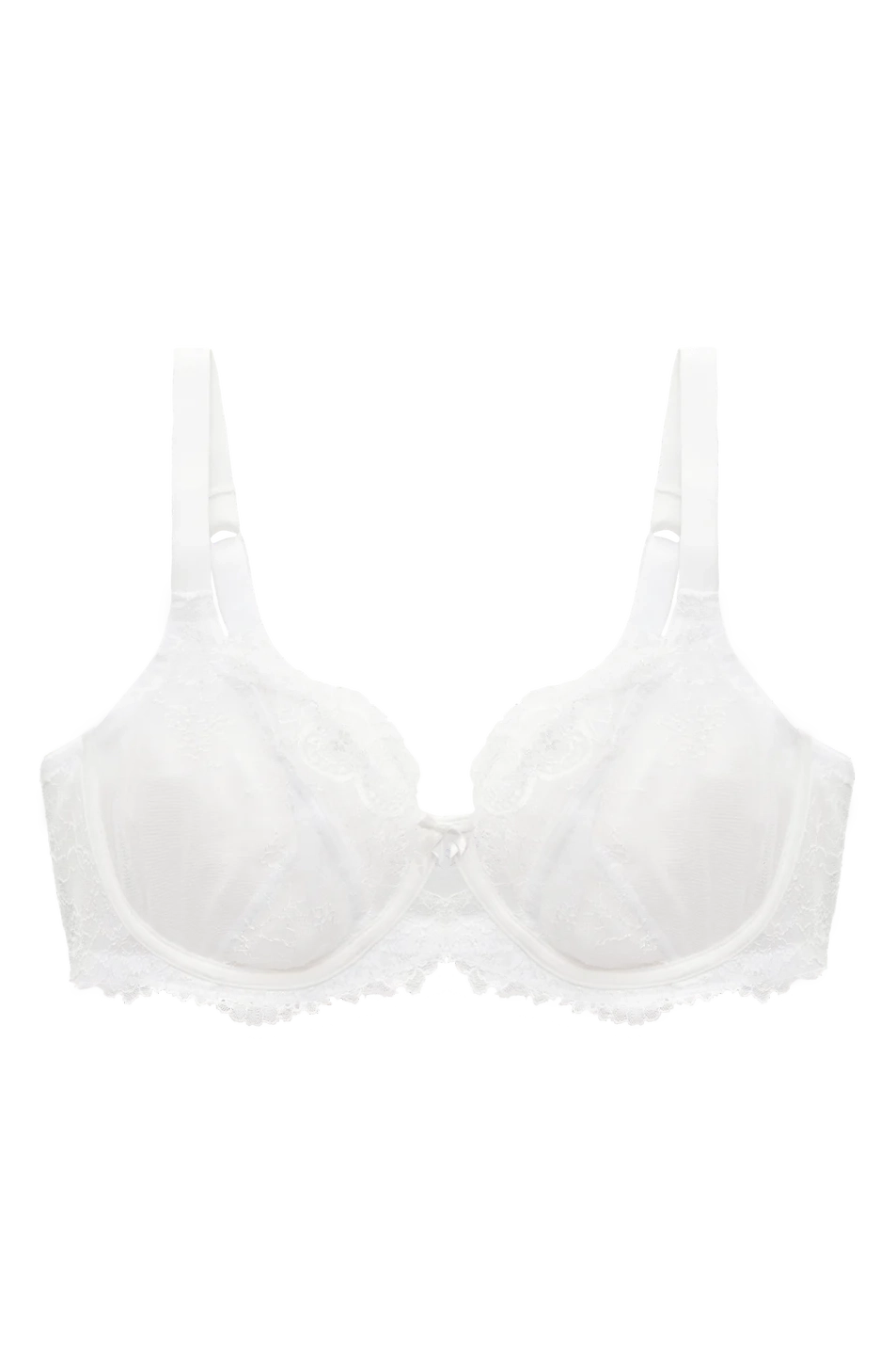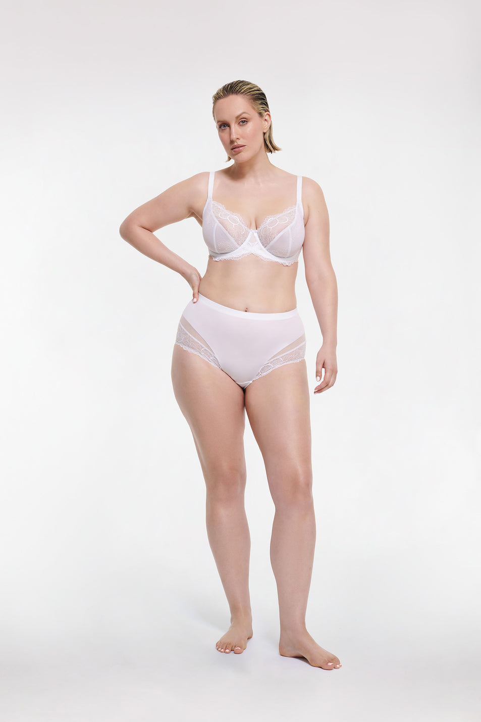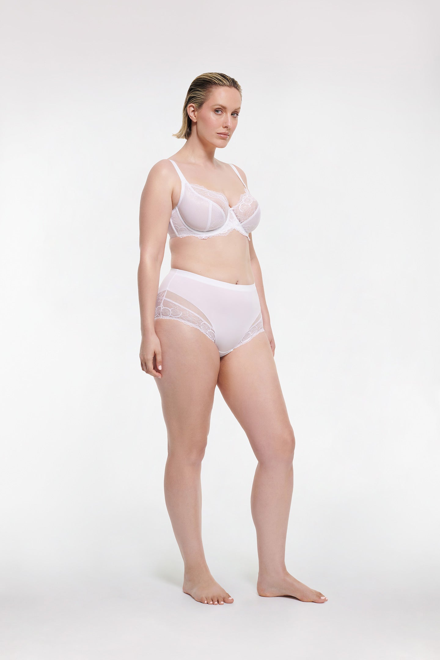 - Soft lace cups with single layer mesh panels encapsulate the bust to gently lift and project forward