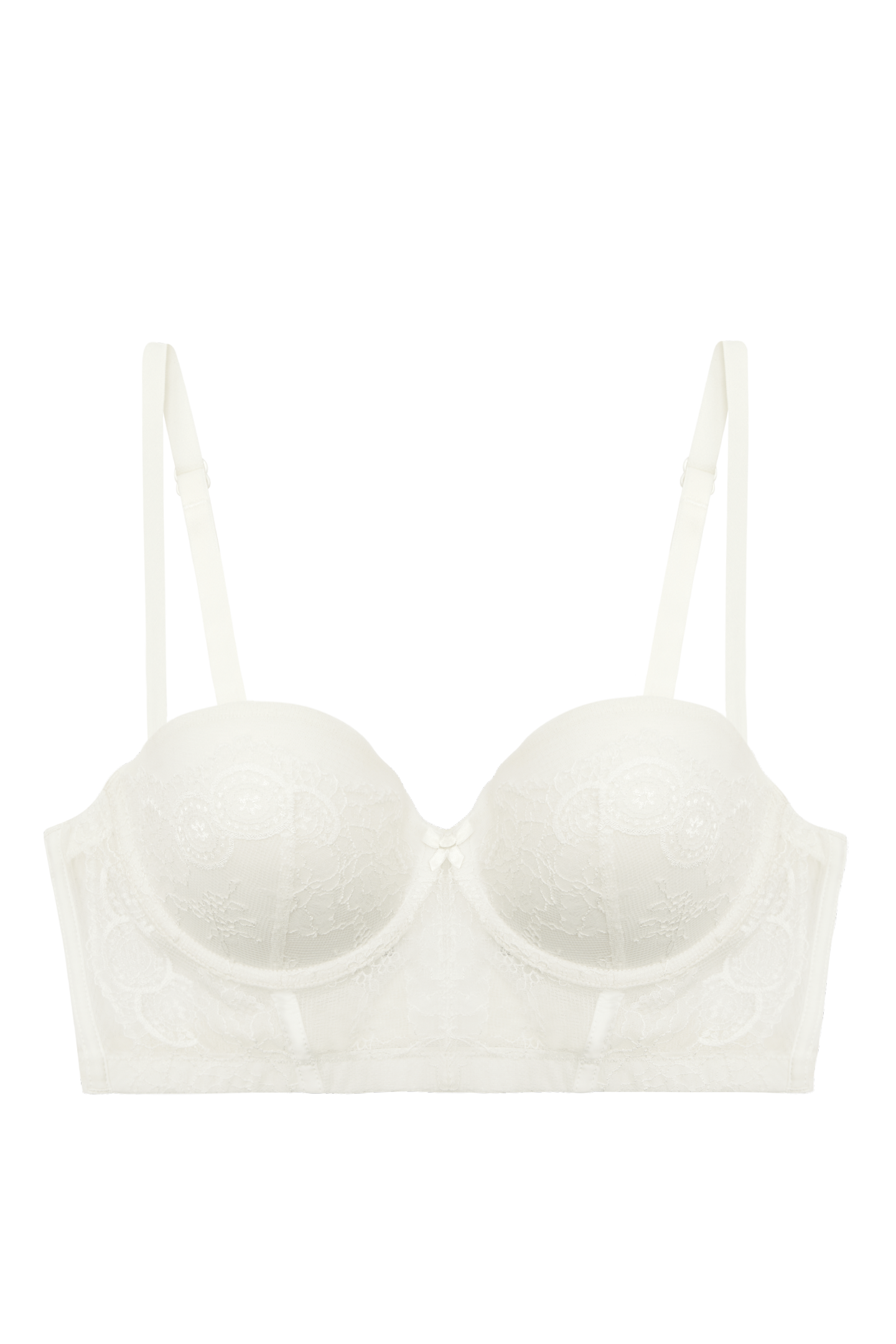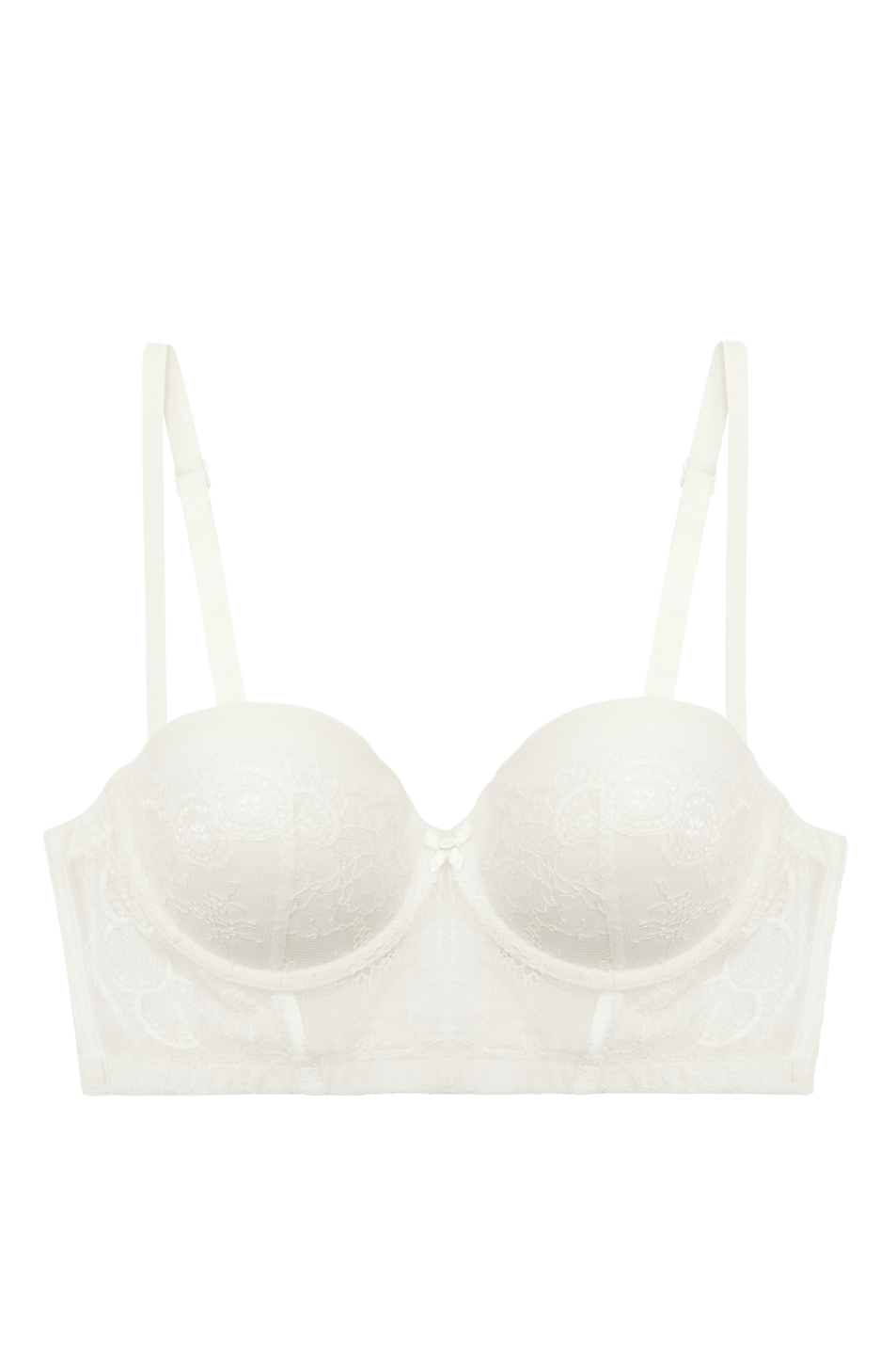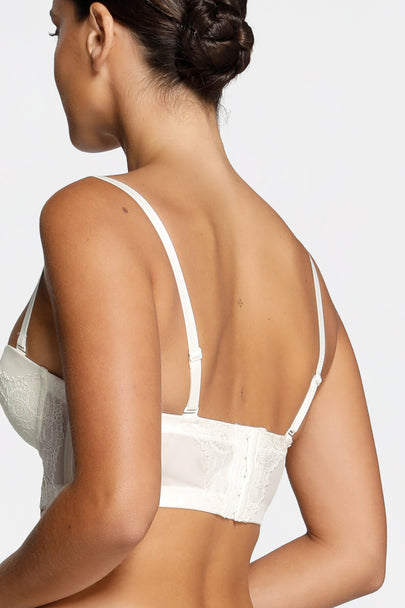 - ½ coverage cups embedded in decorative longline bodice