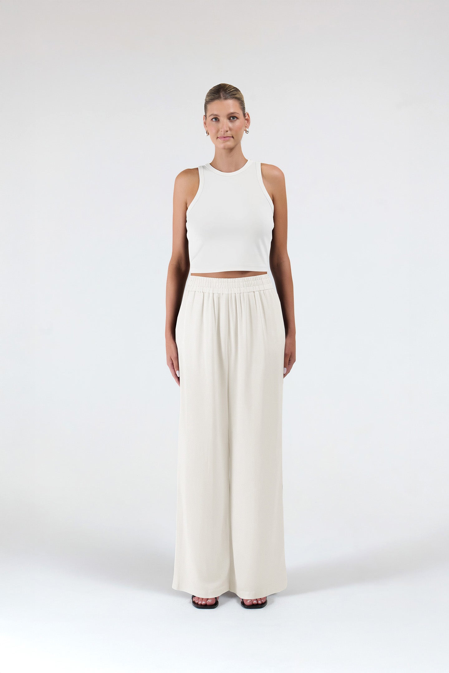 A buttery soft high rise and wide leg pant with elasticated waist and side seam pockets. This silk alternative is breathable, hypoallergenic and easy to care for with a flattering drape.