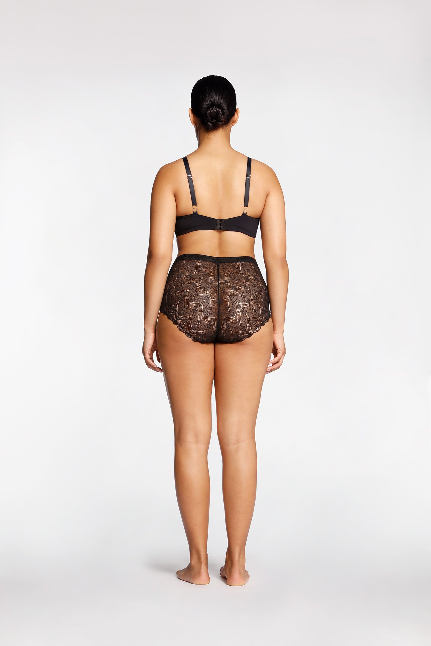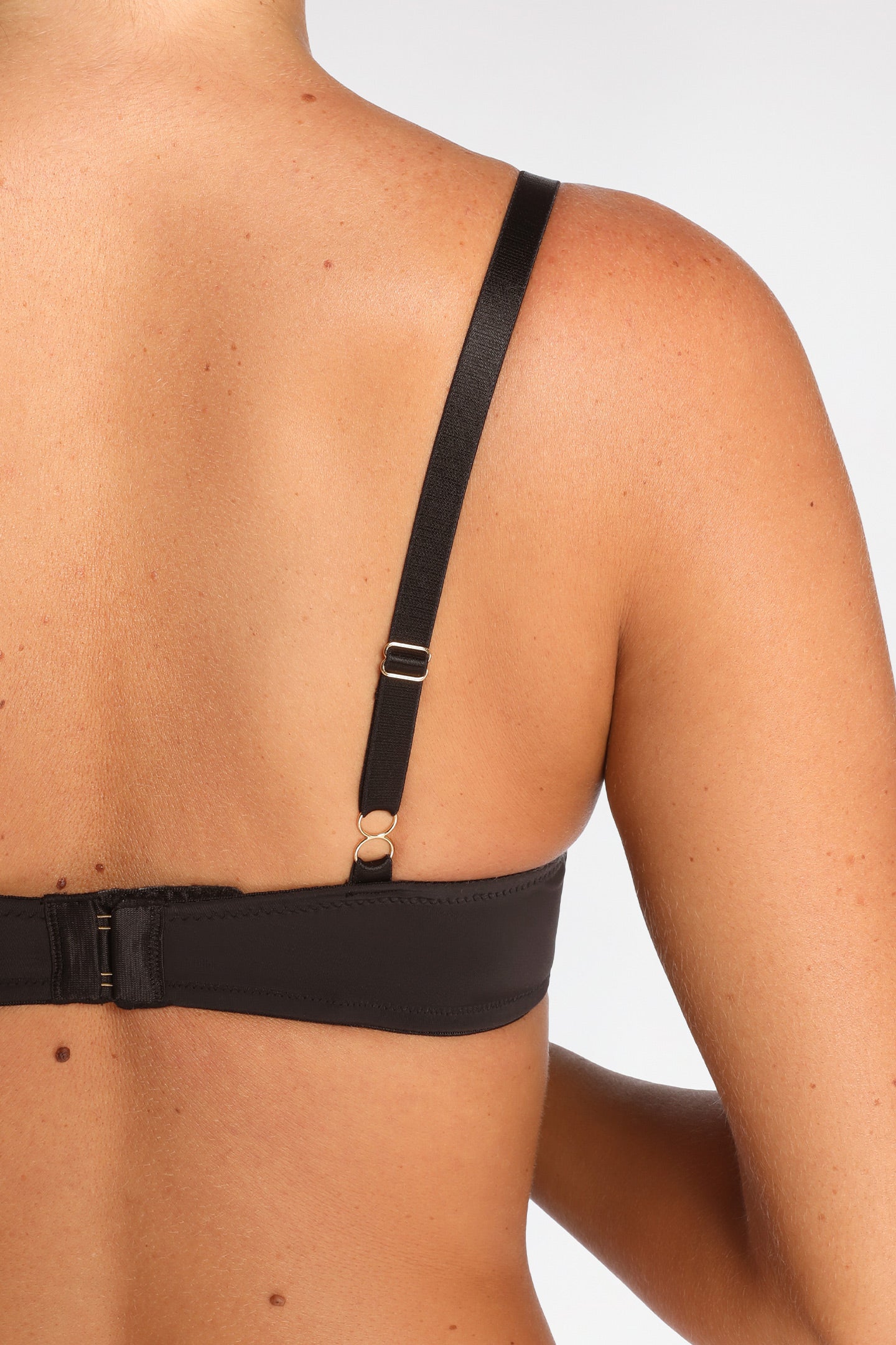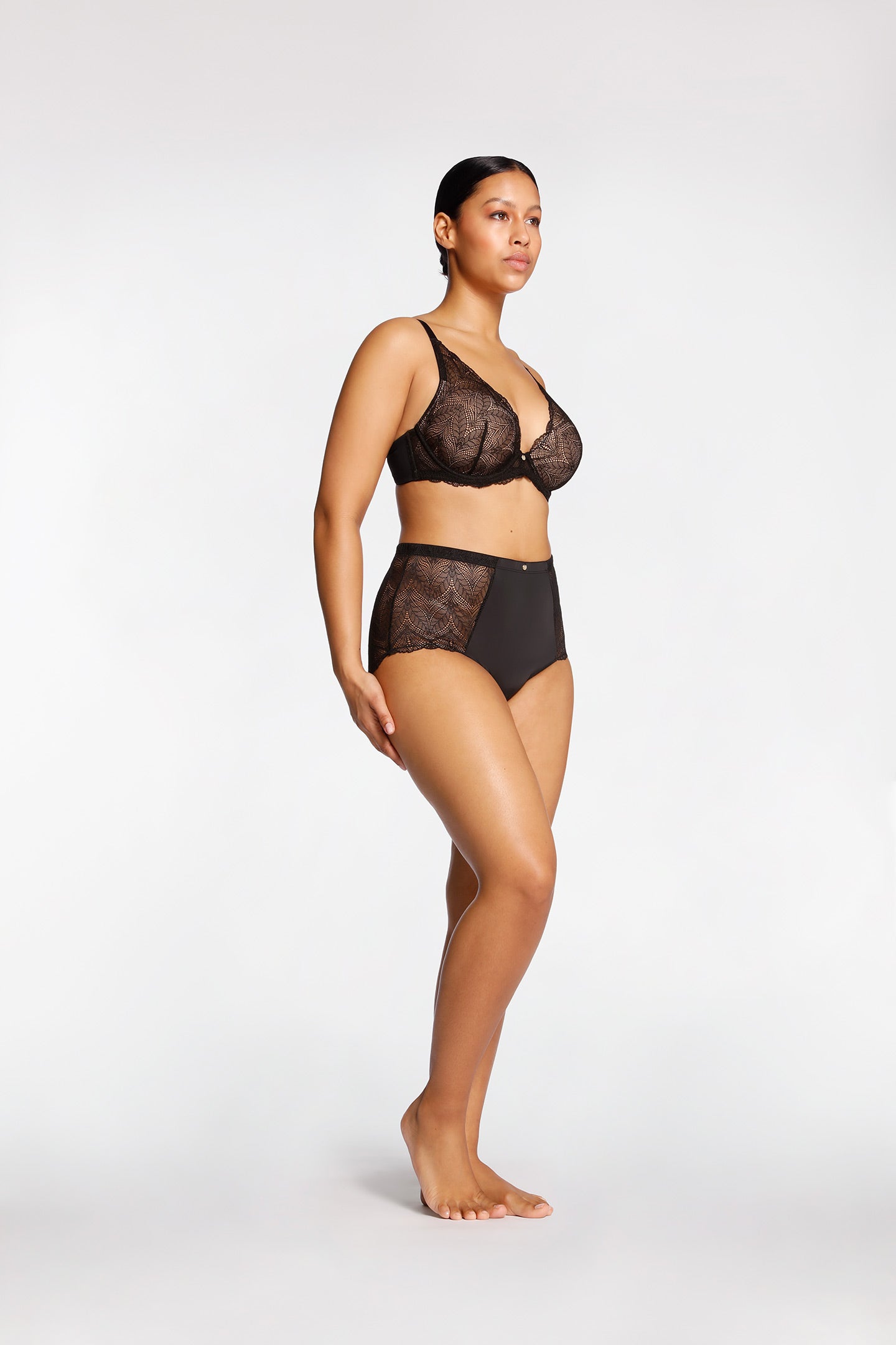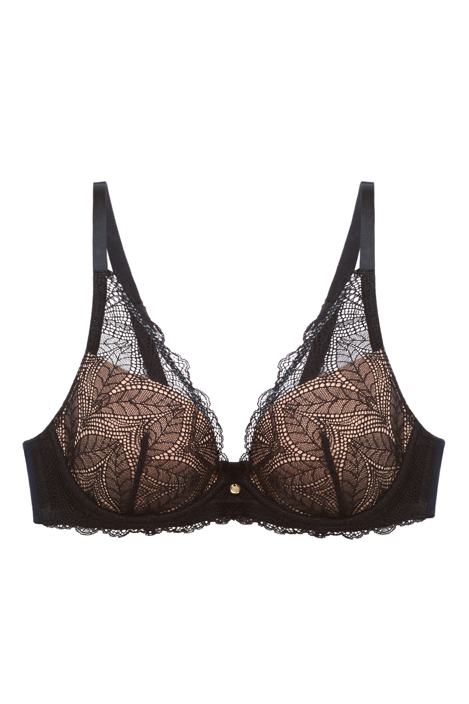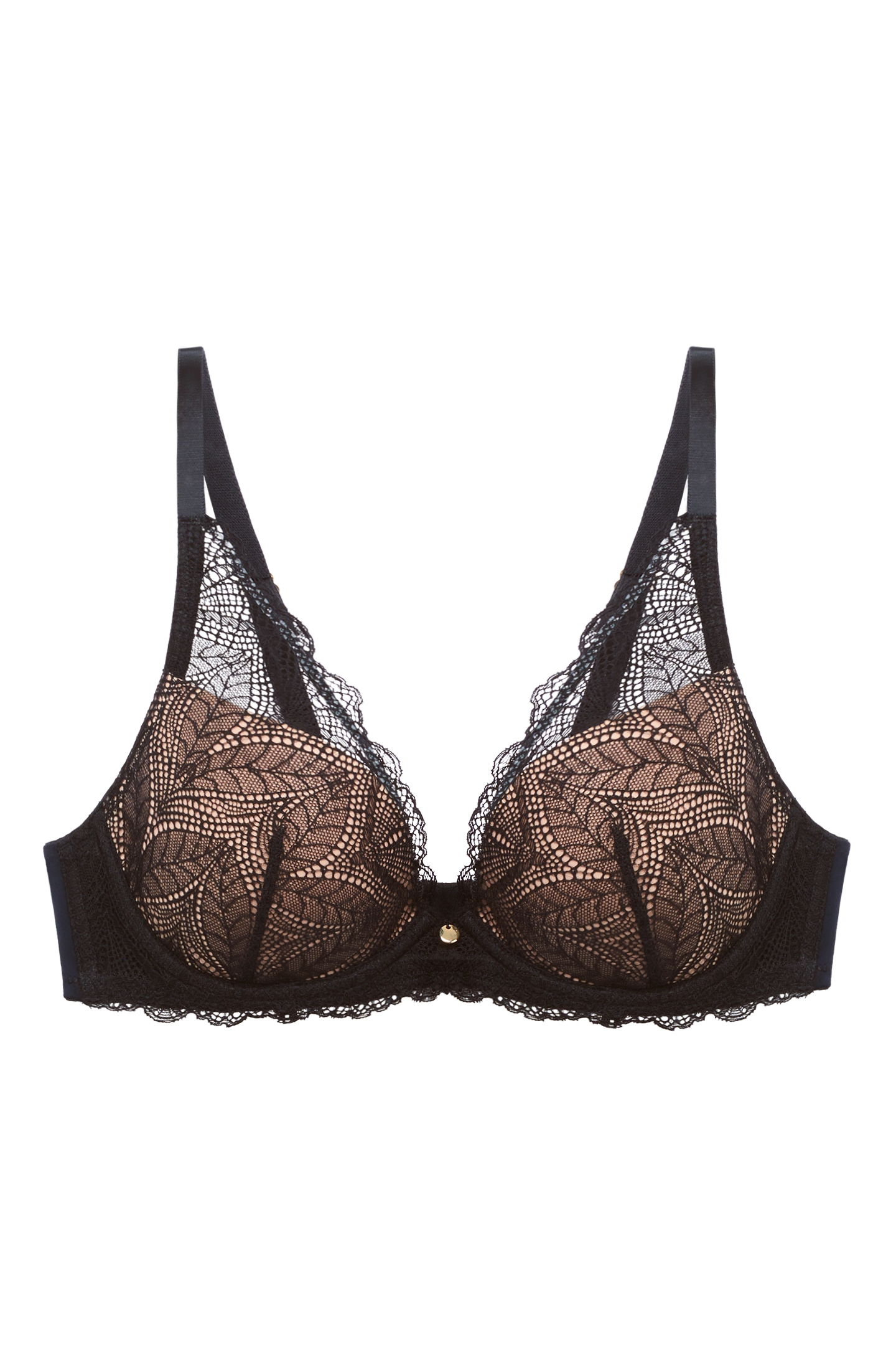 - Extended lace cup encapsulates the bust for universally flattering shape and support.