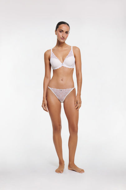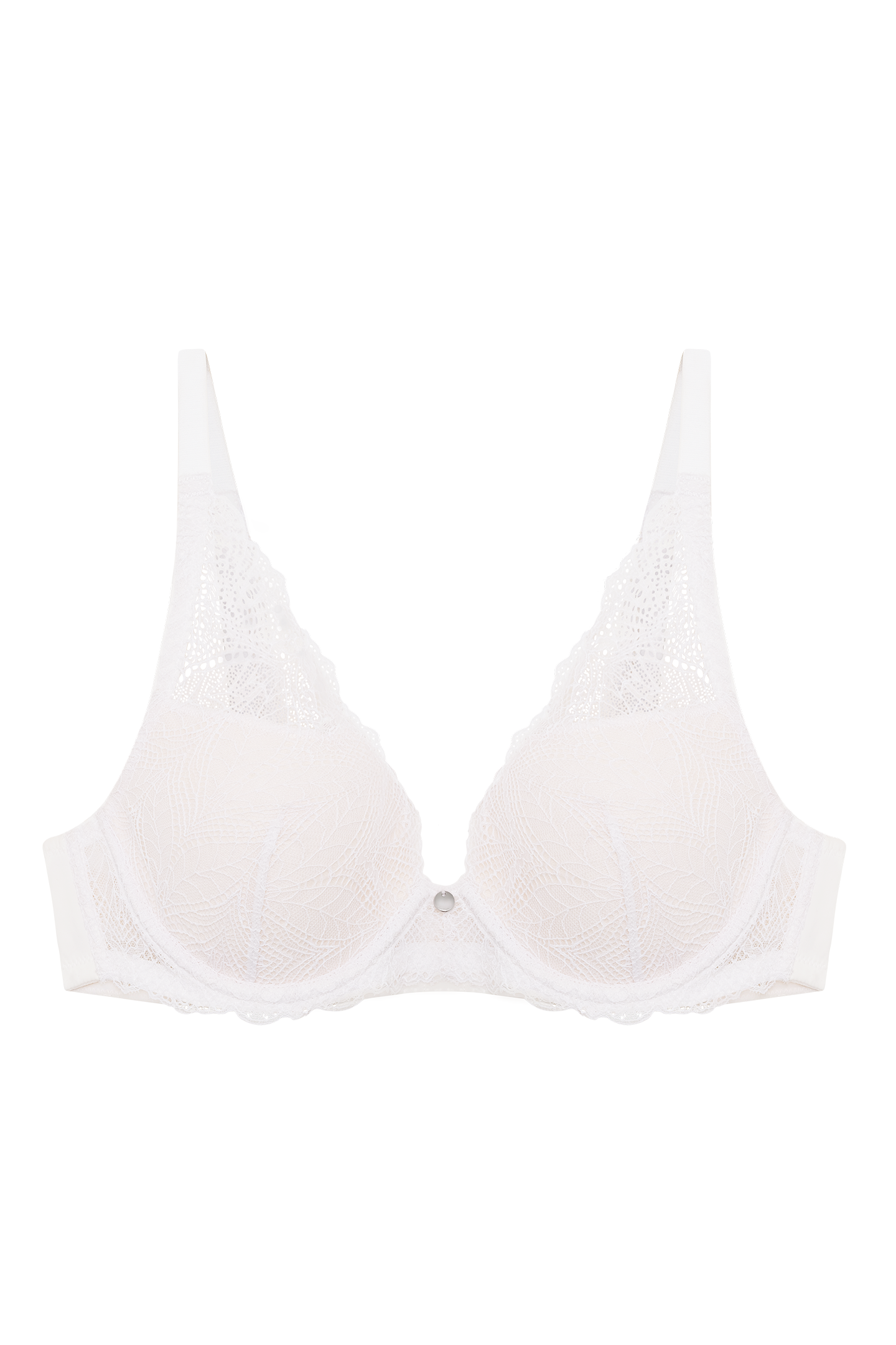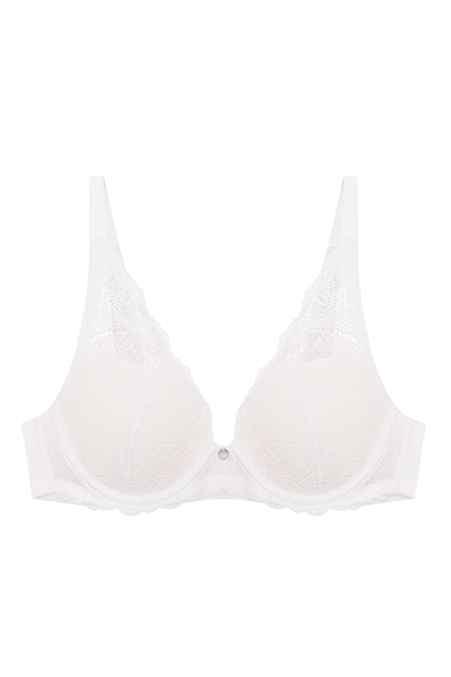 - A deep plunge bra with light foam cups and all-over lace