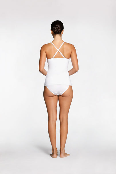 A one-piece bra and camisole for comfortable wear and easy styling. Adjustable straps allow wear as a classic, halter neck or crossback.