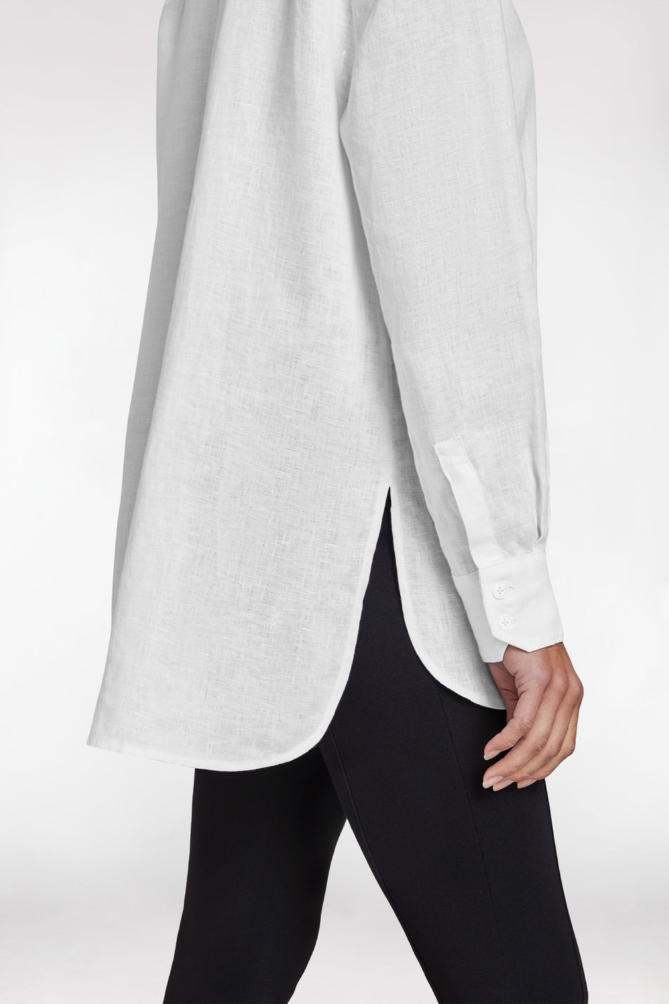 - Side splits with curved edges and dropped back hem