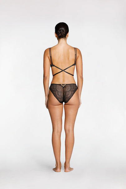 - Stretch lace with mesh lined wings