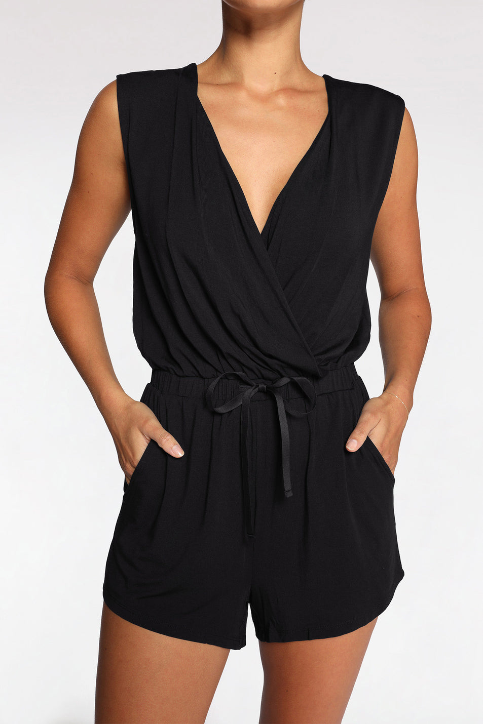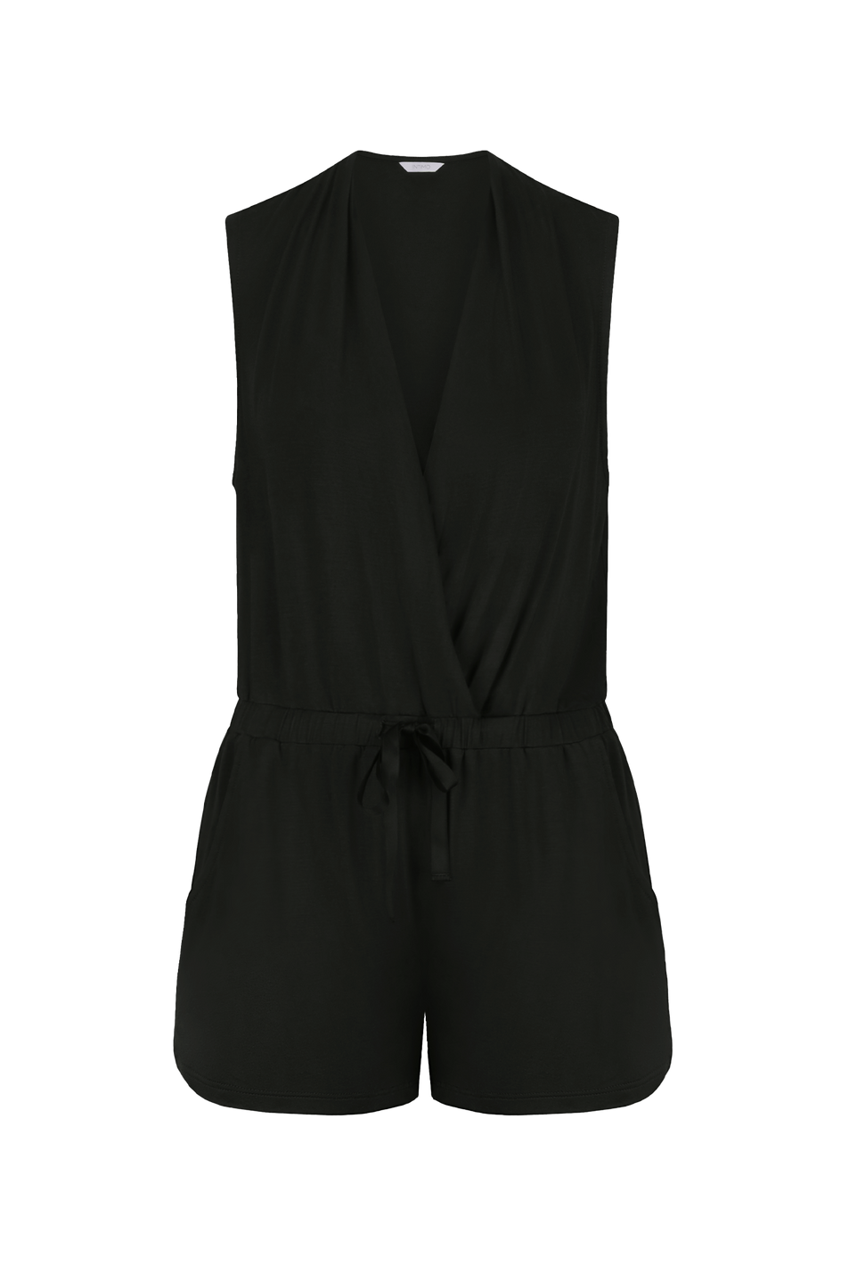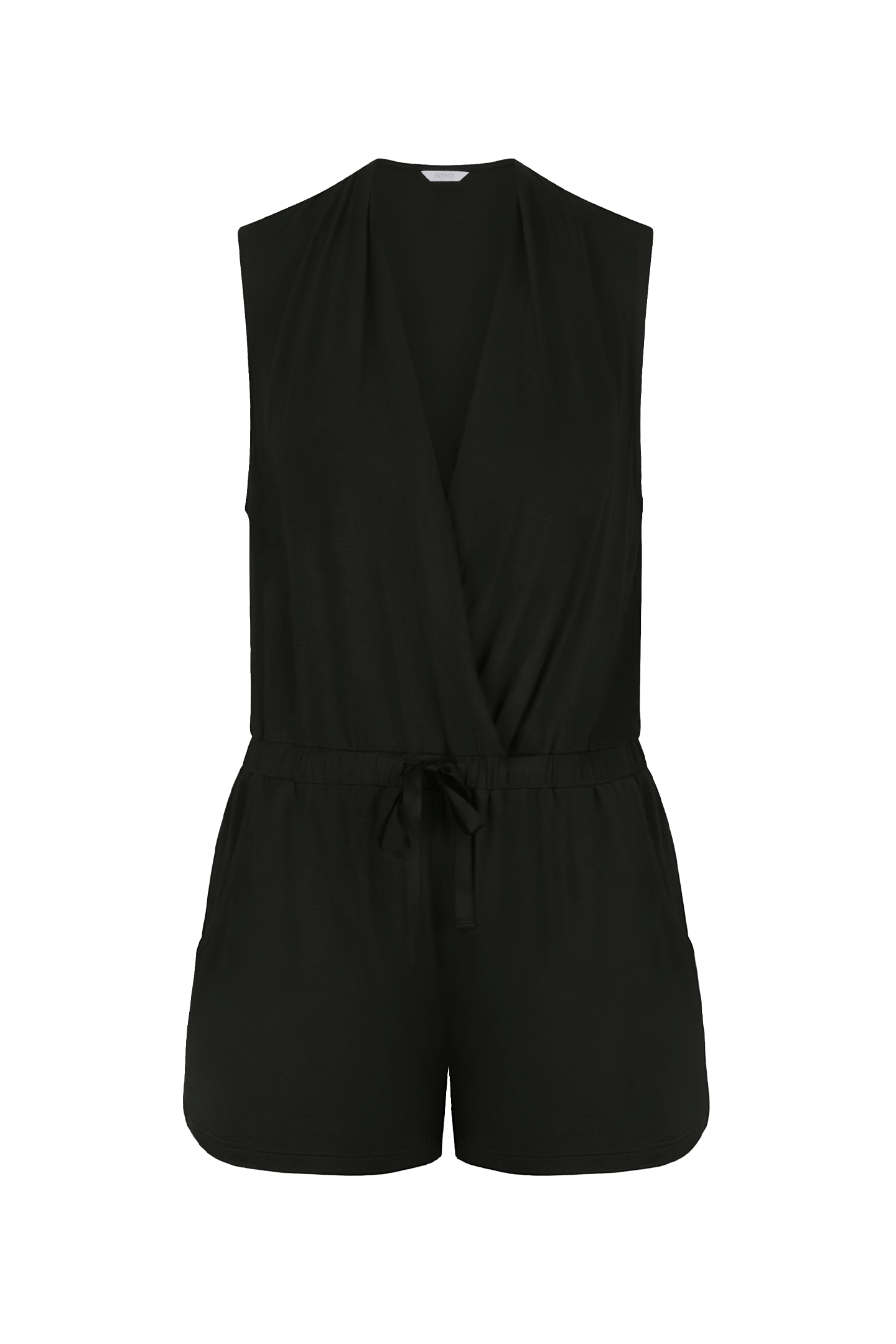 A one-piece lounge suit with drape front neckline and elastic waistband for comfortable wear.