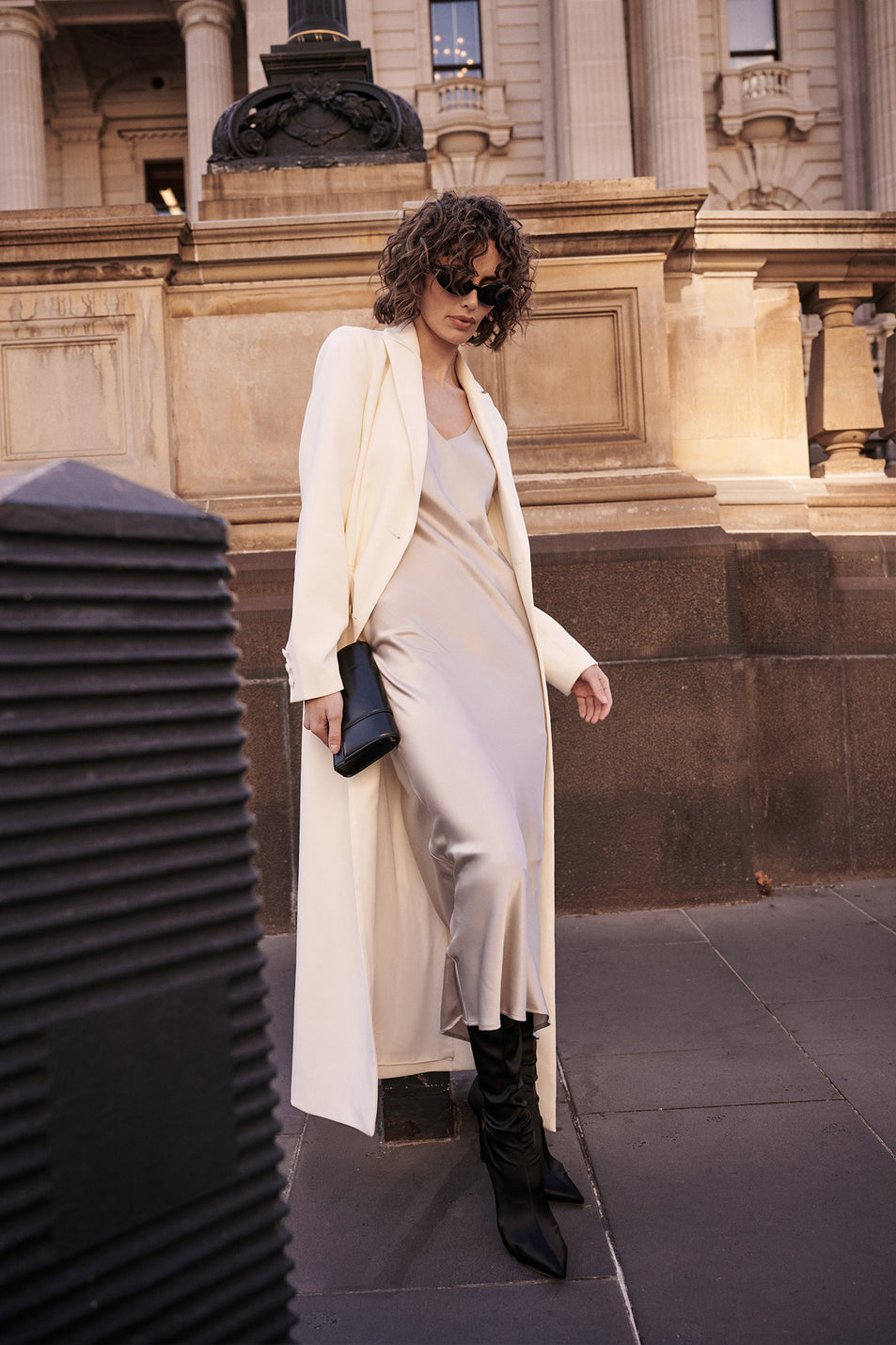 Delivering fluid movement and a luxurious look, Intimo's 100% Silk fabric skims the silhouette for a flattering drape and fit. With a lustrous hand feel and smooth glossy finish, silk offers a lightweight and breathable fabric with thermoregulation properties suitable for wear at every season.
